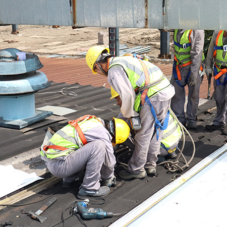 海美防水瓦以鋼板為基板,表面貼覆具有防水防腐功能的TPO/PVC卷材(熱塑性聚烯烴類防水卷材),是海美金屬推出的新一代防水防腐屋面建筑材料。海美防水瓦主要特點就是在各類環境下不易生銹不易漏水,使用熱風焊接進行相連,覆蓋全部裸露的縫隙,在使用過程中可以達到蓄水不滲透的效果,防水效果好,同時還有較好的抗風揭性能和耐老化性能,為鋼結構建筑屋面提供了長久的防護。